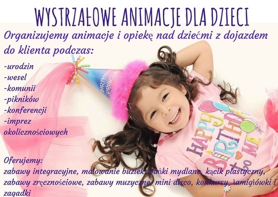 Animacje dla dzieci ? Chętnie pomożemy :) Wesele, przyjęcie , chrzciny i każda inna uroczystość nie okaże się już nudna dla Twojego dziecka . Zorganizujemy ją tak, byś Ty mógł oddać się zabawie wiedząc, że Twoje dziecko spędza mile czas :) Oferujemy zabawy dostosowane do wieku i potrzeb dzieci : -Malowanie twarzy,-Zabawy i gry muzyczne -Magiczne pudełko zadań -Przeciąganie liny-Tańce -Bańki mydlane -Zabawy manualne : plastyczne, -Konkursy z drobnymi nagrodami oraz wiele innych atrakcji , szczegóły do uzgodnienia :)