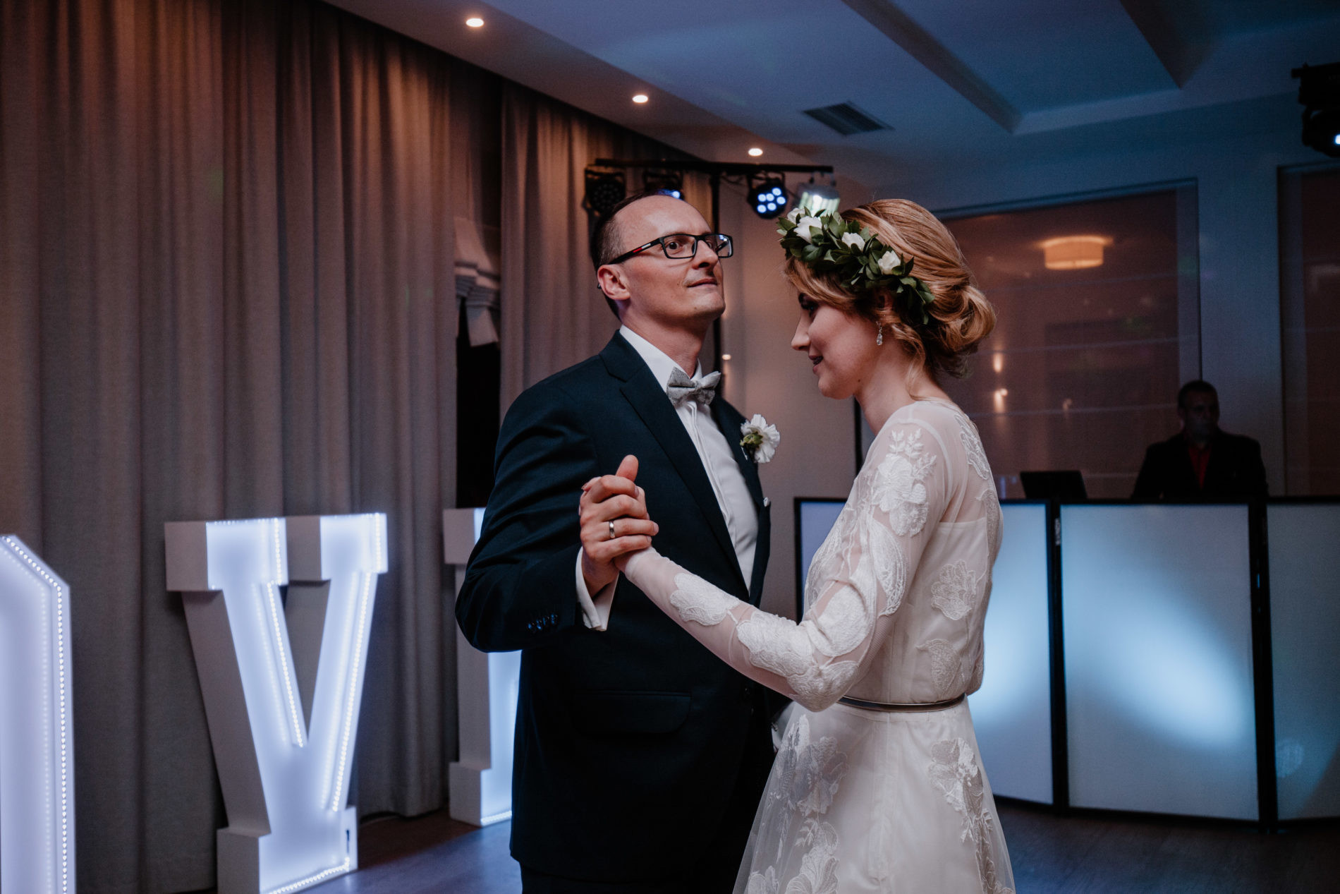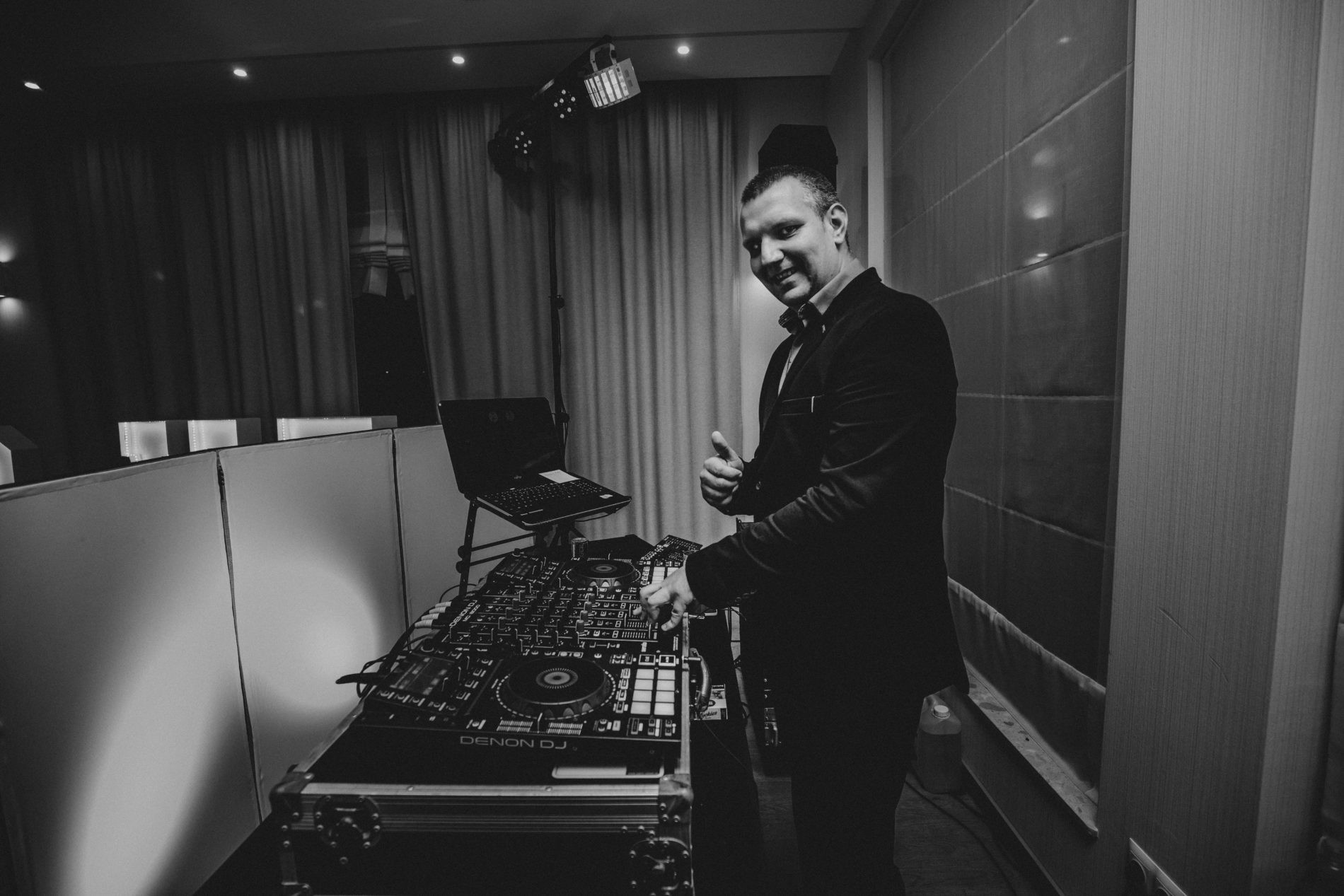 Posiadamy własne stanowisko DJ, osłonięte podświetlanym parawanem (nie jest konieczny, ale według nas wygląda ładniej :) )