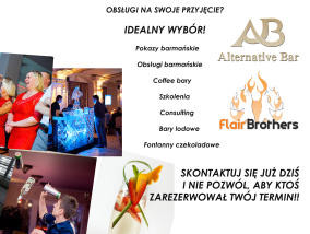 Alternative Bar to agencja barmańska powstała z inicjatywy duetu Flair Brothers skupiająca się na obsługach barmańskich, pokazach sztuki flair, barach kawowych, jak również dodatkach takich jak bar lodowy i fontanna czekoladowa. Nasze usługi świadczo...