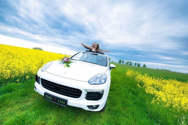Porsche które chcemy państwu zaoferować wyposażone jest w 21 calowe koła Cayenne SportEdition w kolorze Black z poszerzeniami nadkoli. Samochód posiada zawieszenie pneumatyczne z systemem samo poziomowania i funkcją regulacji wysokości które zadba o wysoki komfort podczas podróży oraz wsiadania Panny Młodej. Na tylnej kanapie znajdziemy bardzo dużo miejsca na nogi oraz suknię ślubną. Cayenne posiada duży otwierany elektryczny dach panoramiczny oraz elektryczne rolety przeciwsłoneczne tylnych bocznych szyb w razie upalnych dni. Wnętrze samochodu wypełnia dwukolorowa skórzana tapicerka w kolorze Black - Garnet Red oraz bardzo wyraźne wykończenia z włókna węglowego.
