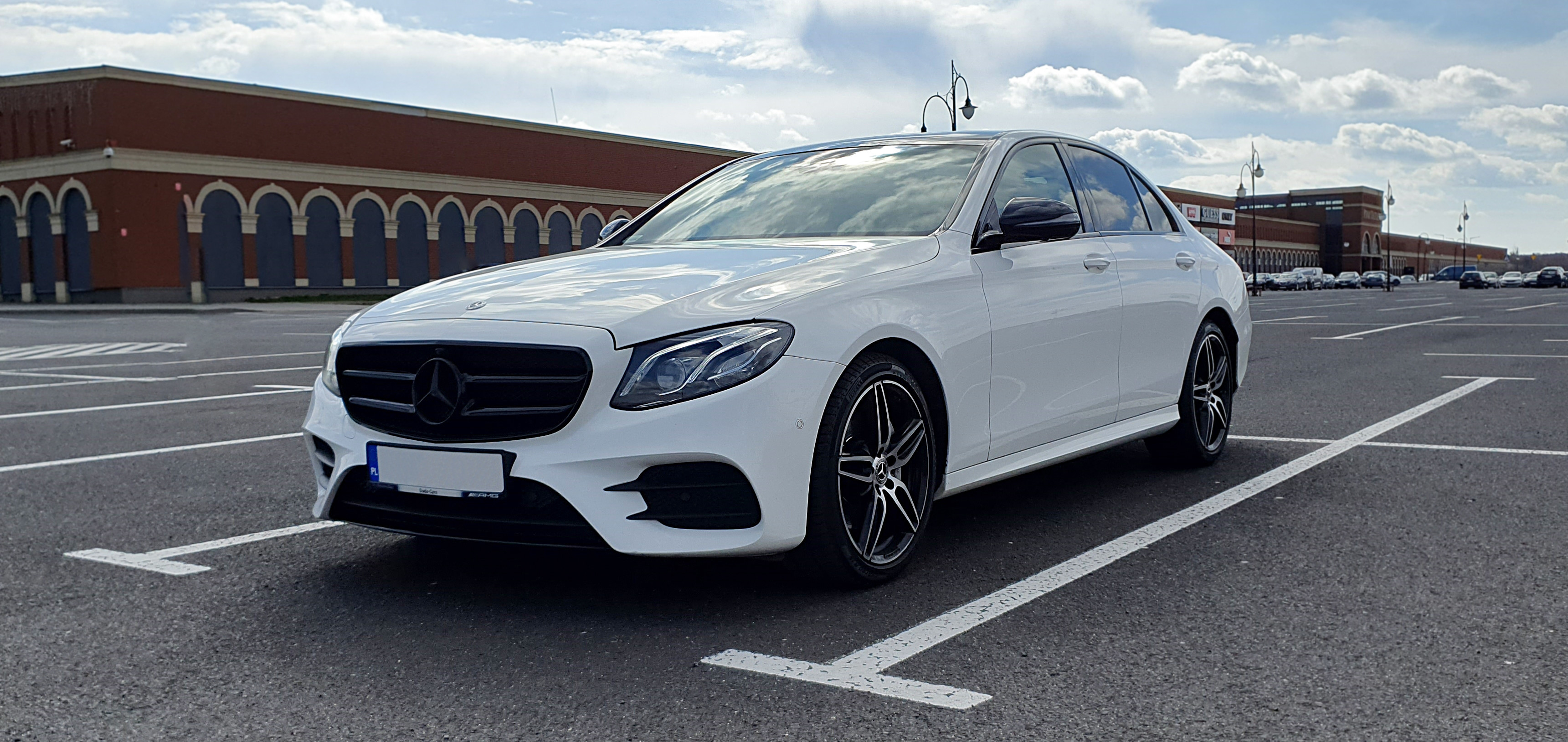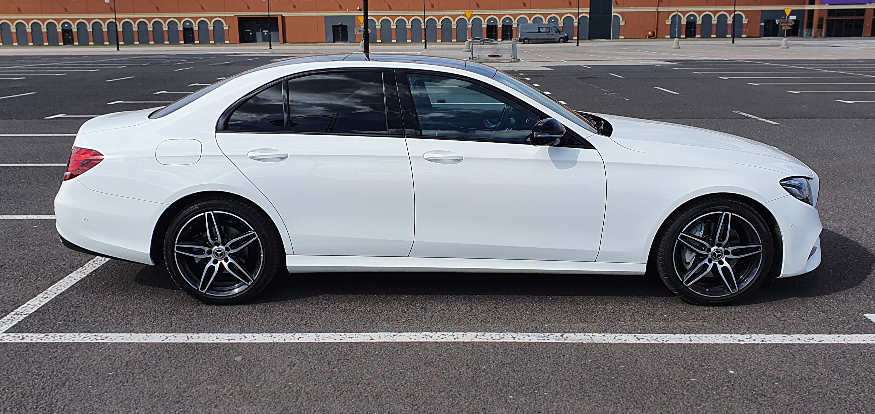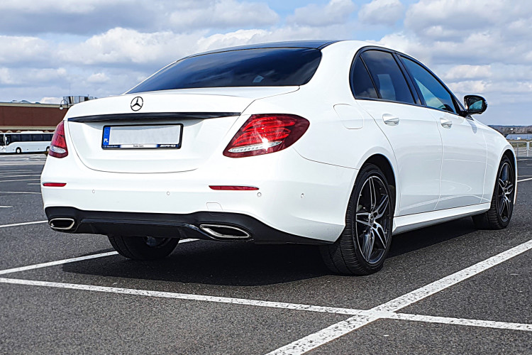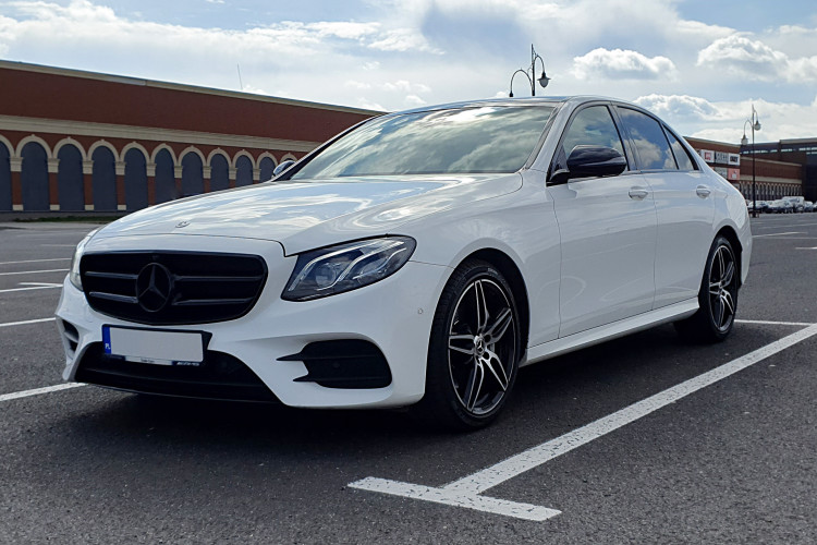 Najnowsza E klasa do Mercedesa (W213) w pięknym białym kolorze, z powłoką ceramiczną, otwieranym szklanym dachem i 19 calowymi felgami wraz z kierowcą.