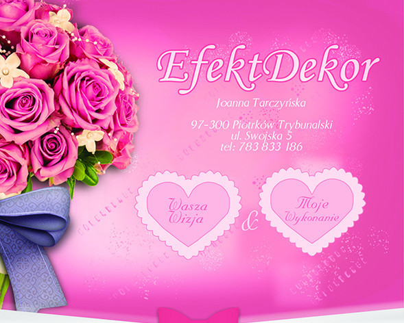 Dekoracje to nasza pasja, dzięki czemu wkładamy w nie całe serce. Stworzymy niepowtarzalny klimat i zadbamy o wyjątkową oprawę Twojej imprezy, sprawiając, że pozostaje ona niezapomniana. Każdy pomysł można kreatywnie wykorzystać. Z przyjemnością zrealizujemy wizje swoje oraz naszych klientów oraz zadbamy o każdy szczegół. To Wasze uczucia i zadowolenie są dla nas najważniejsze i możecie być pewni, że dołożymy wszelkich starań by Państwa najważniejszy dzień w życiu był wyjątkowy.