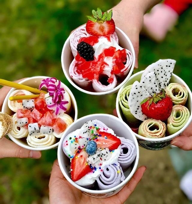 Cała tajemnica tkwi w naturalnej bazie śmietankowej oraz wegańskiej, którą używamy do naszych wyrobów. Jest ona łączona z najróżniejszymi dodatkami, na specjalnie do tego przygotowanej płycie zmrożonej aż do -30°C. Zawsze używamy świeżych owoców oraz markowych słodyczy np. raffaello czy kinder bueno.