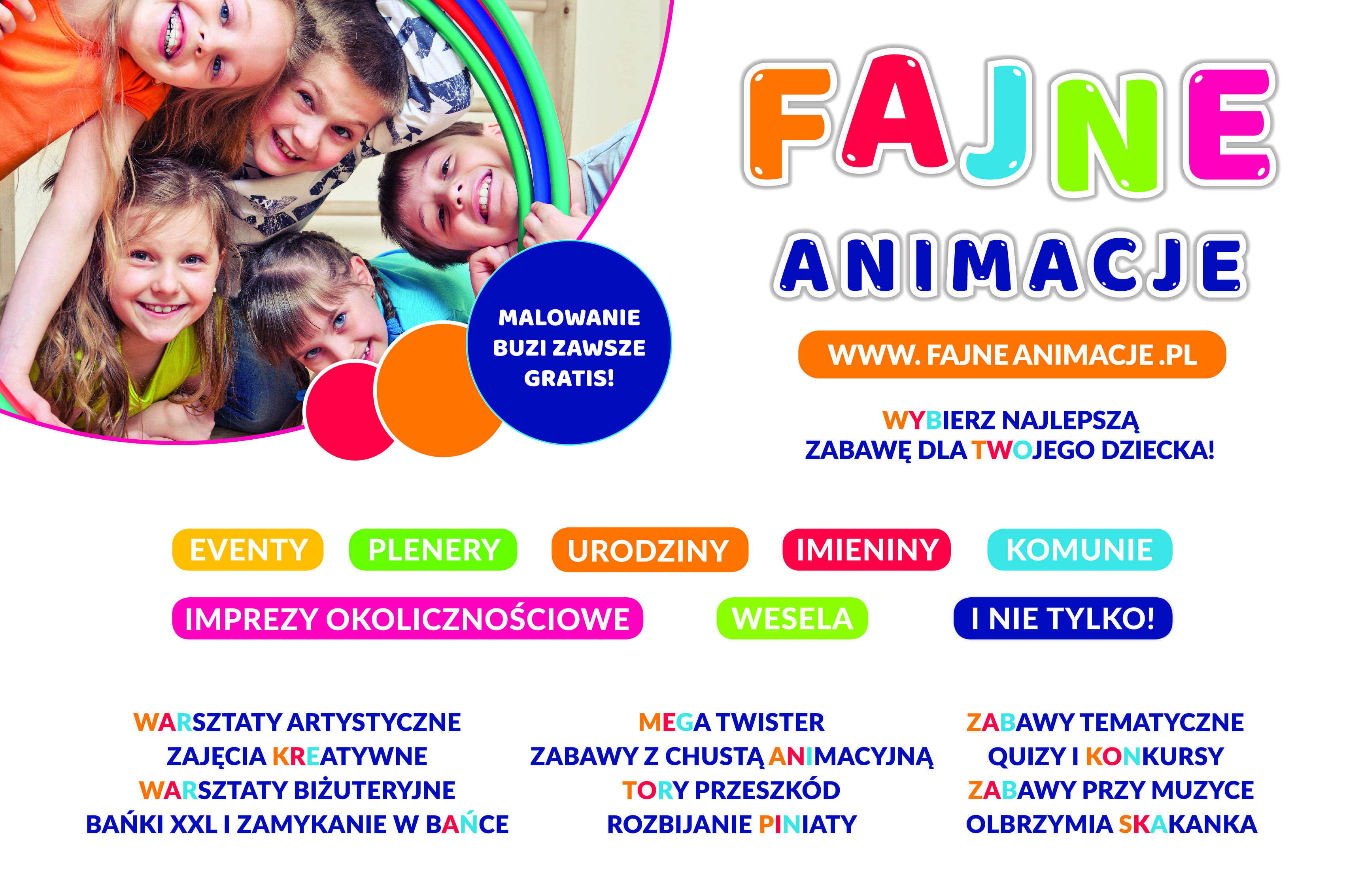 W planie animacji znajdują się zabawy ruchowe i taneczne, zabawy z chustą, a także stworzenie kreatywnego prezentu dla Państwa Młodych. Oczywiście nie byłoby prawdziwej zabawy z animatorem bez pomalowanej buzi, i tego też nie zabraknie. Dziecięce buzie malujemy farbami najwyższej jakości firmy Snazaroo.