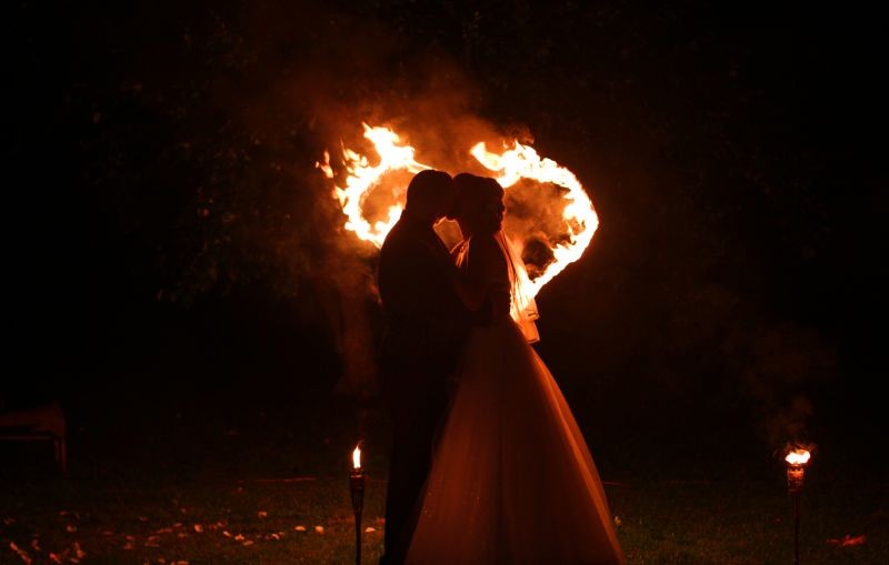 Pokaz tańca z ogniem to świetna opcja urozmaicenia wesela o dodatkową atrakcje a także sposób by zaskoczyć parę młodą jak i gości weselnych .Dlatego też w swojej ofercie posiadamy pokaz Teatru Ognia Fire Dance Crew który idealnie nadaję się na przyjęcie weselne. Jest to pokaz fireshow, który zaczyna się od spokojnych ruchowo i muzycznie układów przechodząc do dynamicznych szybkich choreografii pełnych gracji, całość przeplatana ogniowymi popisami takimi jak: żonglerka łańcuchami, kijami, plucie, połykanie,lizanie ognia a to wszystko w interakcji z publicznością. Kulminacją pokazu jest płonące serce,które płonie w rytm ulubionej piosenki Państwa młodych.