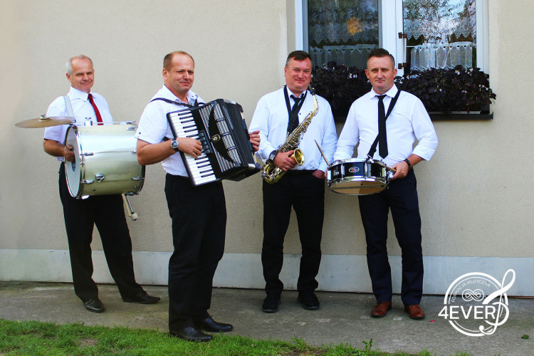Formacja 4EVER działa od 2017 roku i jest świeżą formułą, aczkolwiek doświadczenie sceniczne członków zespołu to ponad 25 lat w różnych zespołach: Gen, Gold-Band, Faner - Band, Paradoks. Mamy nadzieję, że imprezy z naszym udziałem pozostaną Wam na długo w pamięci. Oferta W naszym repertuarze znaleźć można największe przeboje polskiej i zagranicznej muzyki rozrywkowej, od niezapomnianych utworów lat 60-70, po współczesne hity. Gramy muzykę pop, dance i muzykę ludową akustycznie na wyprowadzkę u Pana Młodego i Pani Młodej. Chętnie gramy wyprowadziny akustycznie w składzie saksofon alt, akordeon i instrumenty perkusyjne tj. bęben basowy, talerz i werbel. W trakcie wesela akustycznie gramy również biesiady. Na Wasze wesele mamy przygotowany repertuar około 500 piosenek i utworów instrumentalnych. Możemy się pochwalić również dużą gamą marszy i krakowiaków, które wracają do łask podczas uroczystości weselnych. O północy oczywiście robimy oczepiny, mamy przygotowany repertuar zabaw. Przykładowo dla Państwa Młodych tradycyjnie rzucanie wiankiem i muchą, test na zgodność, dla wszystkich „Mam chusteczkę haftowaną czy „Jedzie pociąg z daleka” oraz wiele innych. Jesteśmy także otwarci na wszelkie Wasze propozycje zabaw i ciągle wprowadzamy nowe, popularne zabawy. Muzyka na żywo, jak również idealny czteroosobowy skład, przy jednocześnie szerokim instrumentarium (klawisze, perkusja, gitara elektryczna, gitara basowa, saksofon) to nasze atuty. Nie musicie się obawiać wysokich kosztów spowodowanych wieloosobowym składem generującym bardzo wysoką cenę. Na Waszym weselu zapewniamy najwyższej jakości sprzęt nagłośnieniowy oraz oświetleniowy, który zapewni odpowiedni klimat i brzmienie oraz profesjonalne instrumenty: