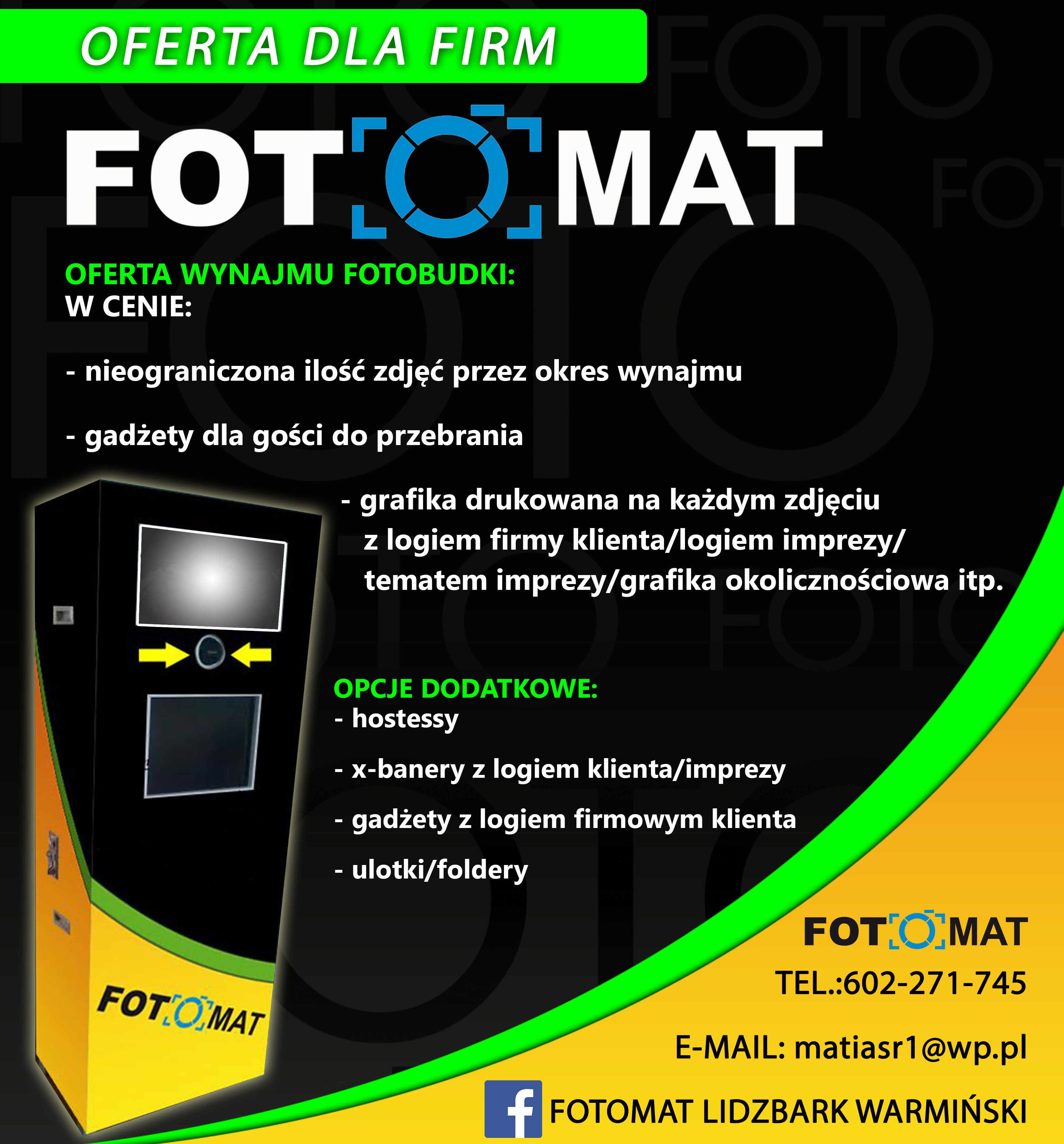 NAJLEPSZA CENA W KRAJU. Witam serdecznie, posiadam świetną atrakcje na wesela którym jest Fotobudka, jest to mobilne urządzenie które robi zdjęcia i natychmiast je drukuje, co daje swietny efekt dla gości imprezy, którzy mogą odrazu obejrzeć swoje zdjęcia podczas zabawy weselnej. Posiadam szeroką ofertę usług związanych z Fotobudką tj. hostessy, x-banery i banery rollup, oklejenie maszyny pod tematykę imprezy, grafika pod tematykę imprezy, nieograniczona ilość zdjęć podczas działania maszyny, oraz wszystkie zdjęcia zgrane po imprezie na pendrive już w cenie. Posiadam duże doświadczenie jeśli chodzi o wynajem fotobudki, jestem na rynku już od ponad 3 lat i brałem udział na różnego typu imprezach, dzięki temu potrafię również doradzić w kwesti czasu oraz pracy maszyny na weselu. Cechuje mnie wysoka kultura pracy, elastyczność warunków wynajmu, dobra prezentacja usługi a to wszystko w najniższej cenie w kraju. Posiadam 100% zadowolonych klientów. (fotki z imprez do obejrzenia na FB (Fotobudka Fotomat Lidzbark Warmiński) Polecam Mateusz 602-271-745