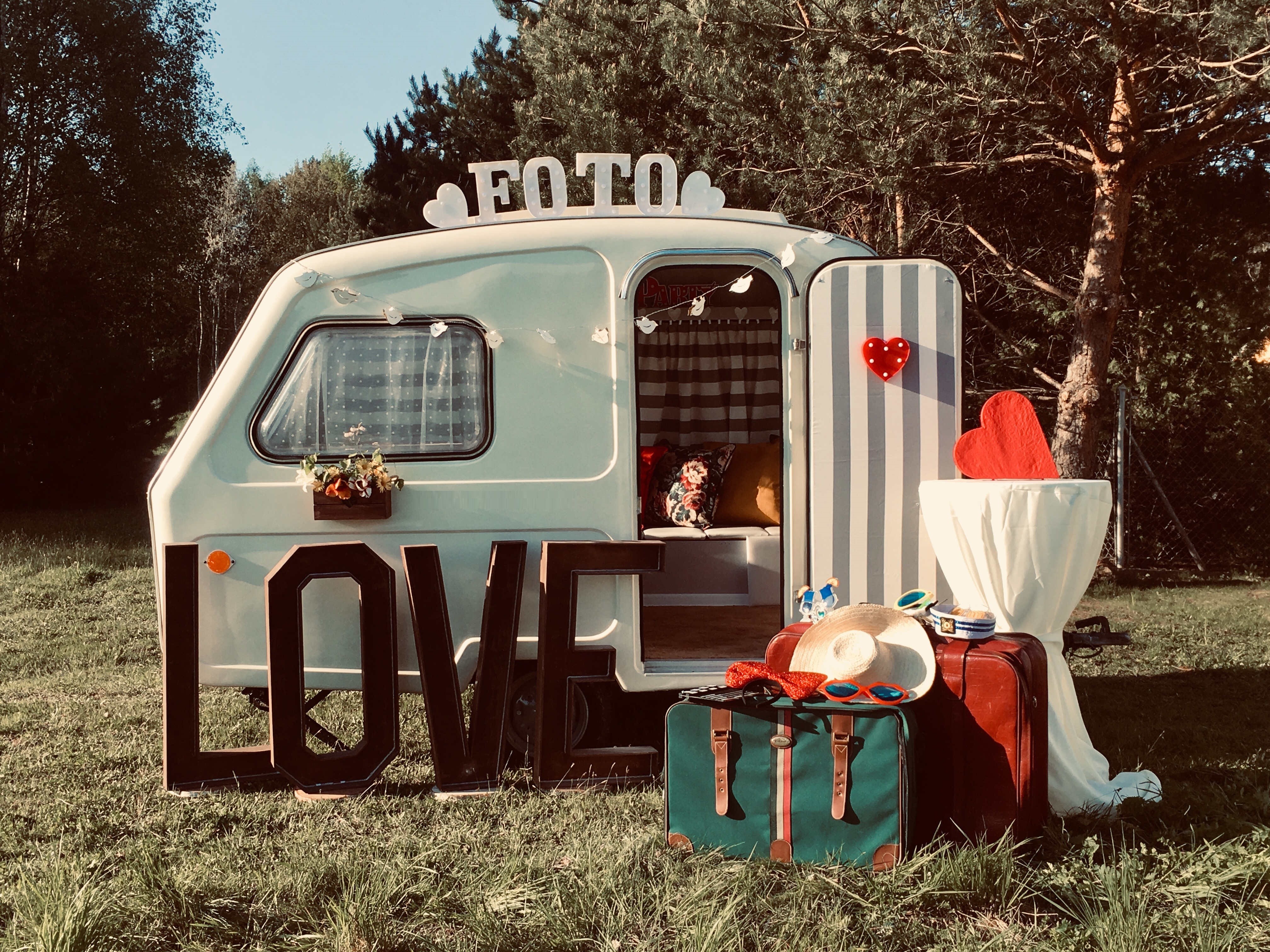 Fotobudka, mobilna fotobudka, w ofercie też ciężki dym do pierwszego tańca. Napis love rustykalny i biały.