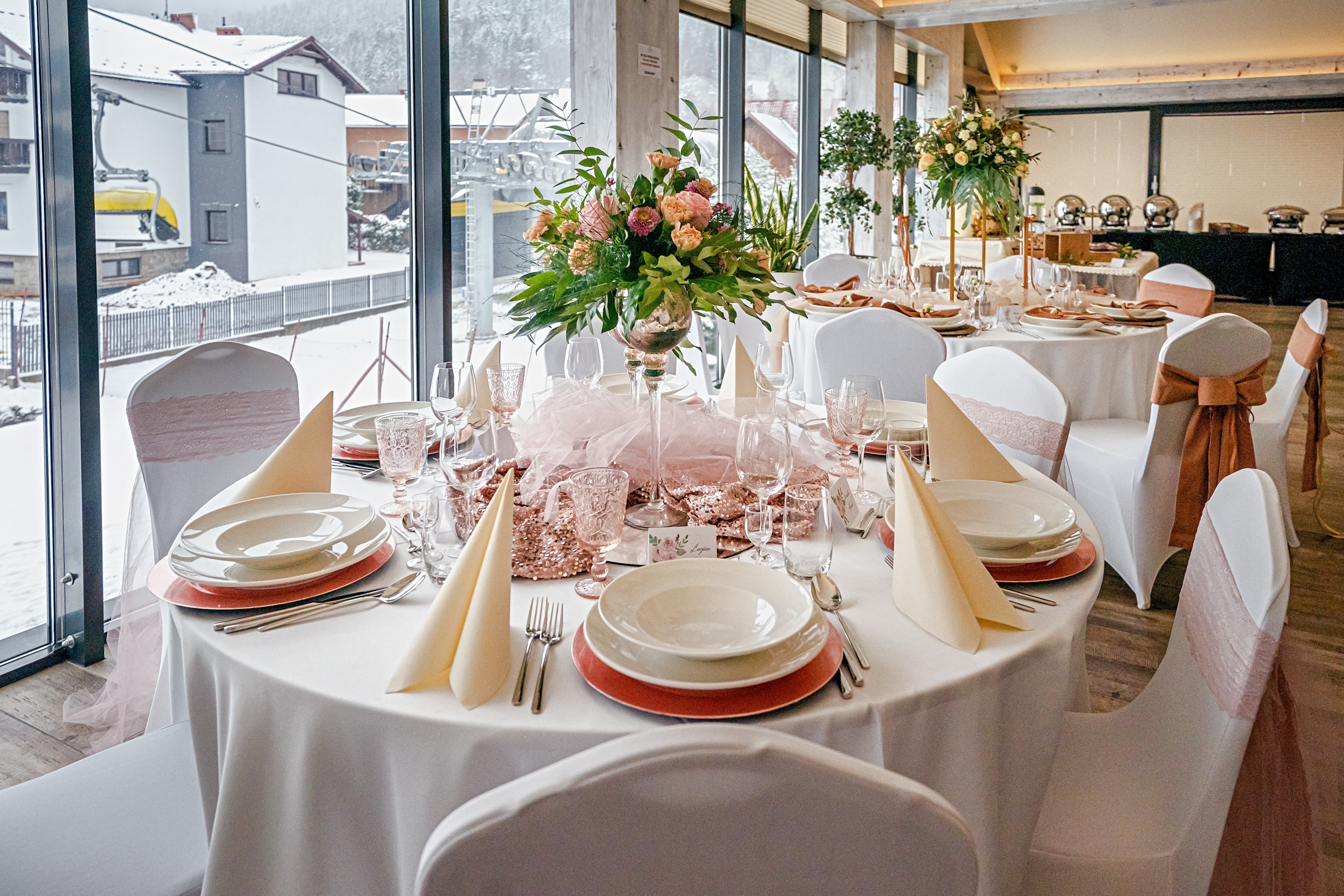 Dodatkowo oferujemy również 3 sale restauracyjne (Tarasowa z Lustrzaną, View Bar oraz Kominkową). W pierwszej organizujemy wesela dla 130 osób, natomiast w dwóch pozostałych – przyjęcia do 80 osób.