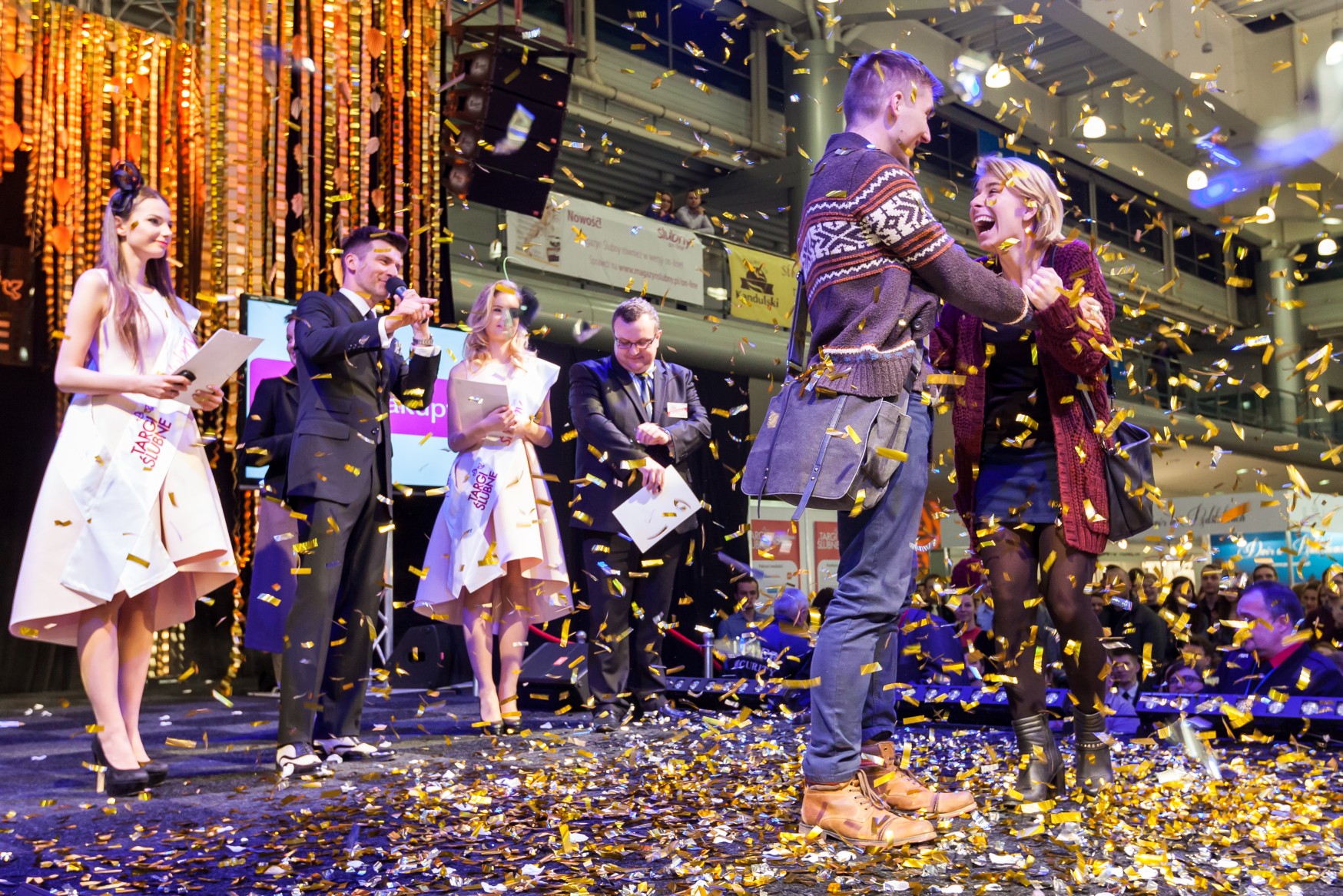 Do wspólnej zabawy na widowiskowo zaaranżowanej scenie zaprosi zwiedzających Olivier Janiak, który poprowadzi program sceniczny. W jego trakcie odbędą się oszałamiające pokazy mody ślubnej połączone z prezentacjami biżuterii i obuwia ślubnego. Nie zabraknie pokazu mody męskiej, a także degustacji pysznego weselnego tortu. Program sceniczny będzie oczywiście urozmaicony profesjonalnymi występami tanecznymi oraz wysokiej klasy występami muzycznymi i wokalnymi. Na koniec odbędzie się wyczekiwany finał konkursu, czyli walka o wspaniałą wycieczkę do Rzymu!