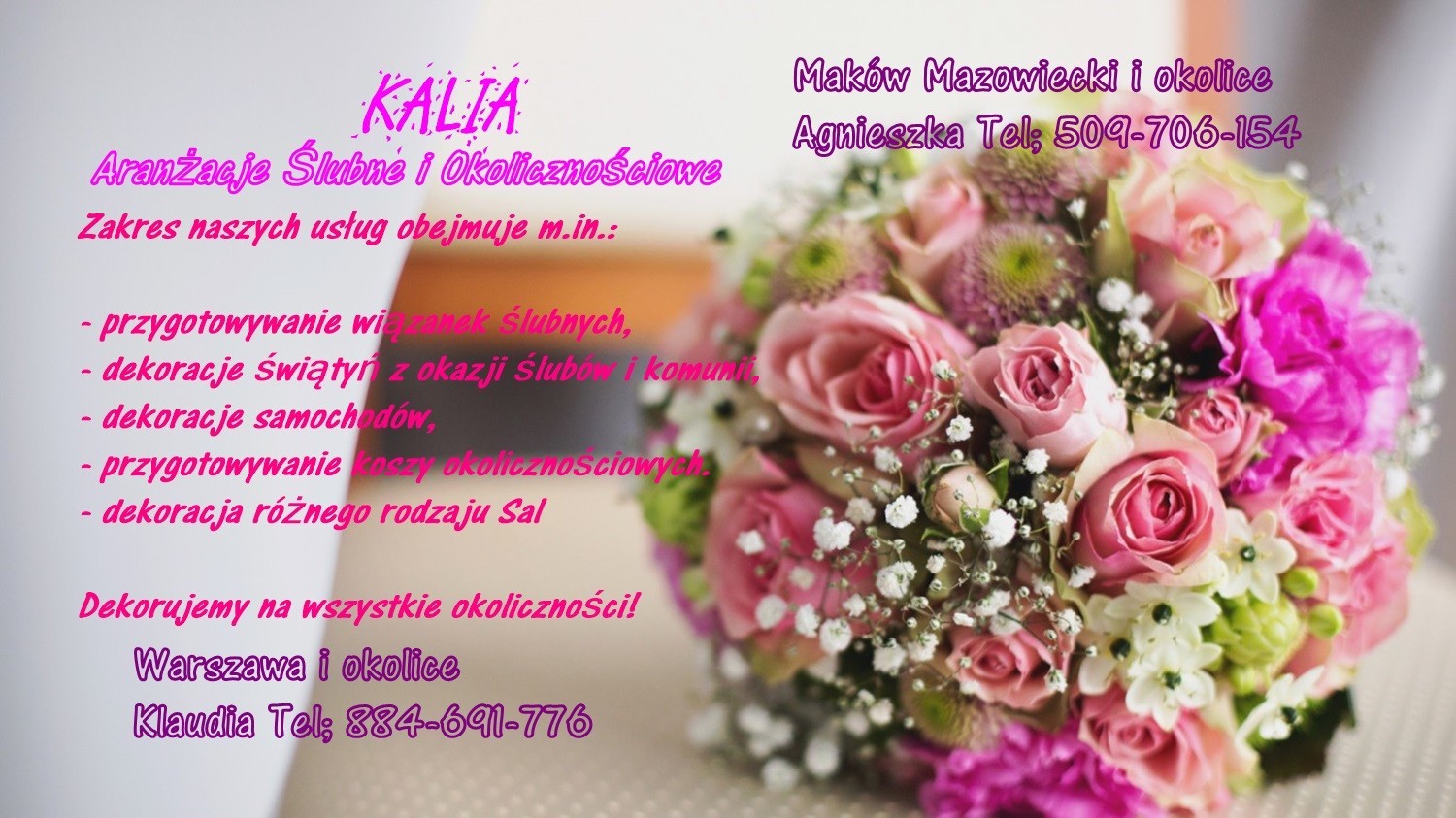 Firma dekoracji i aranżacji KALIA. Zajmujemy się dekoracjami ślubnymi Sal weselnych,Kościołów,Komunii oraz wszelkich imprez okolicznościowych także firmowych.