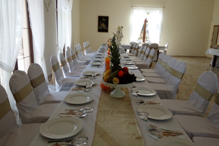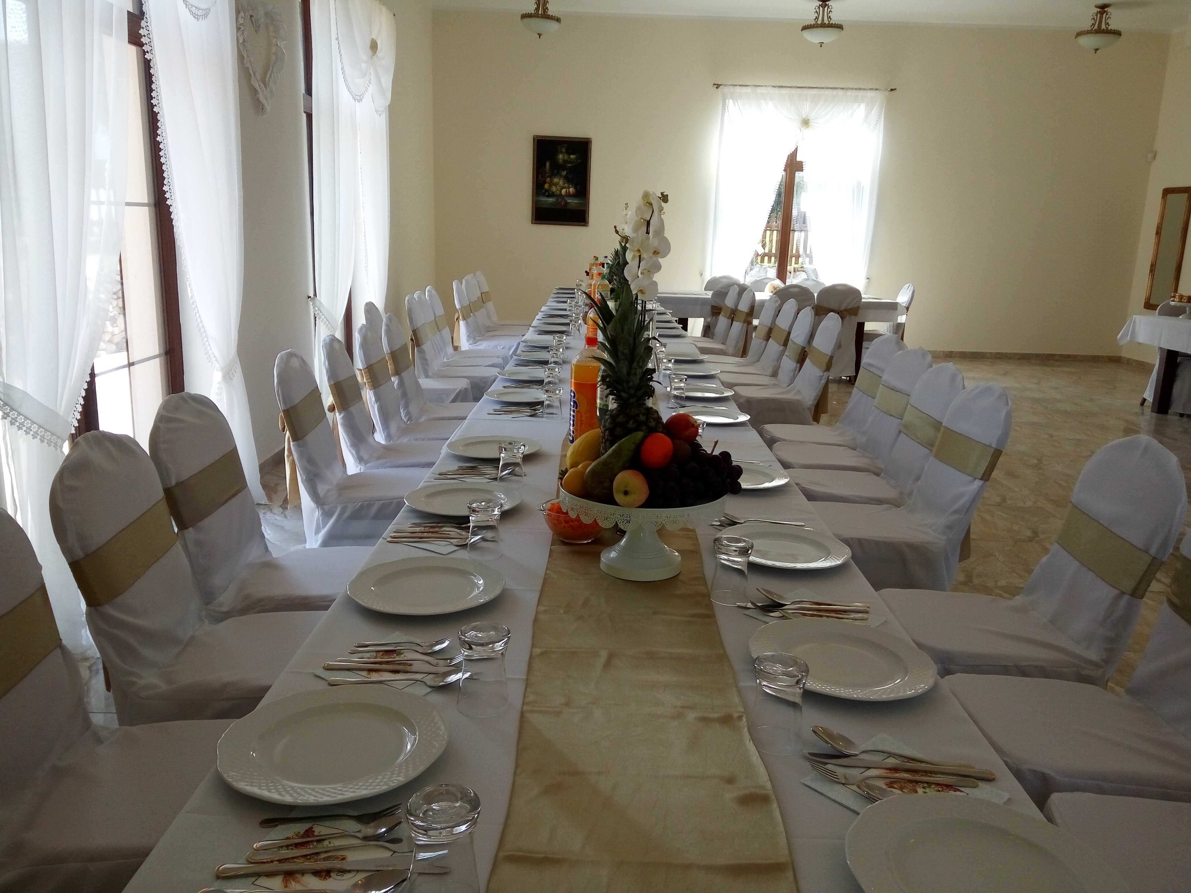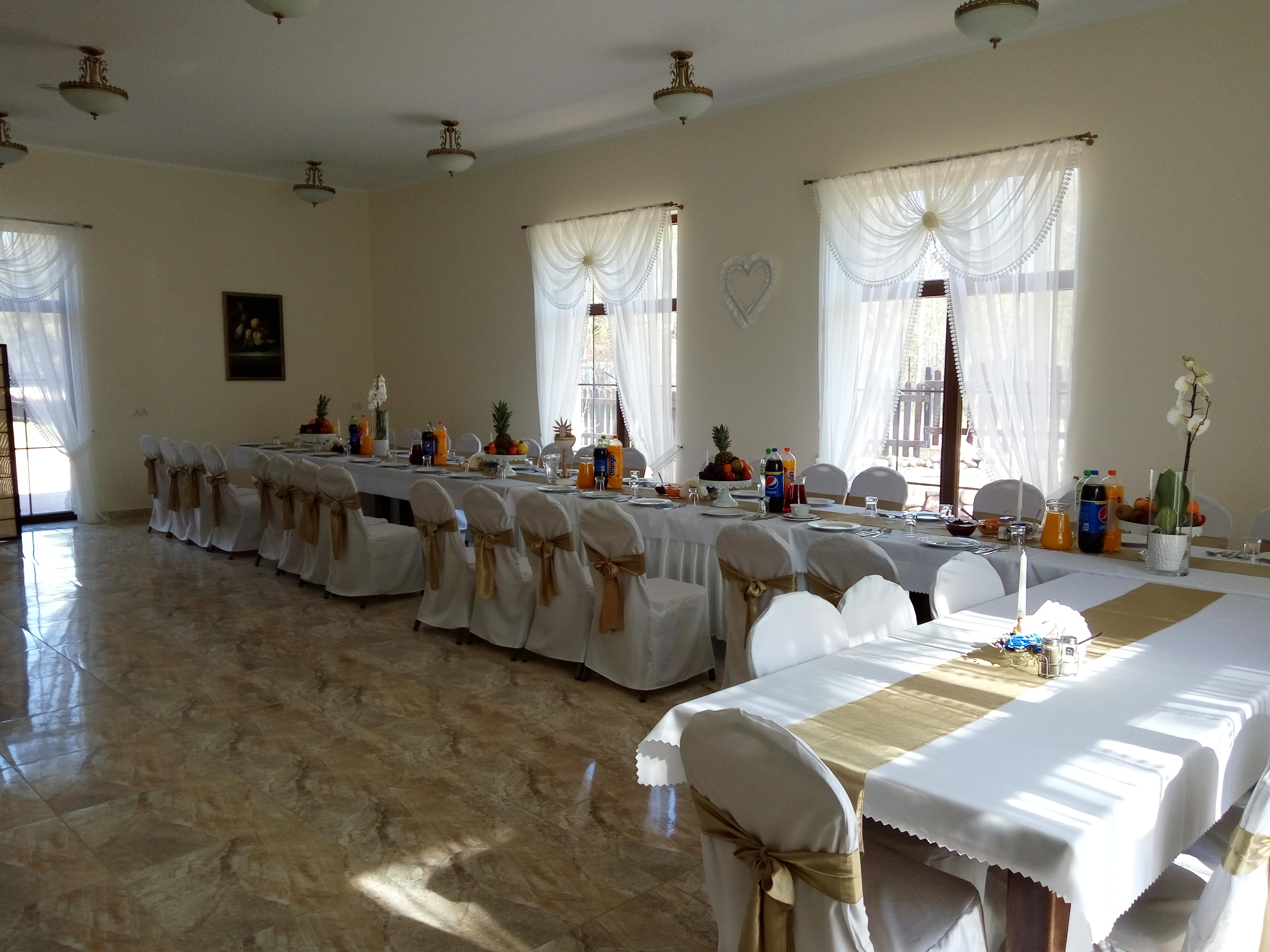 Sala weselna wykonana jest w bogatym stylu, dominuje stare złoto oraz marmur i kamień (podłoga z wysokim połyskiem, lustra na sali w ramach w kolorze starego złota podobnie żyrandole,obrazy w ramach ze starego złota, krzesła z dodatkiem starego złota - możliwość wypożyczenie białych pokrowców na krzesła).
