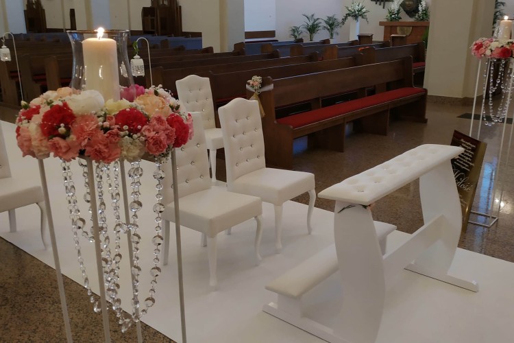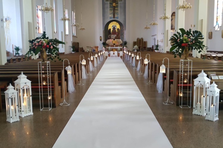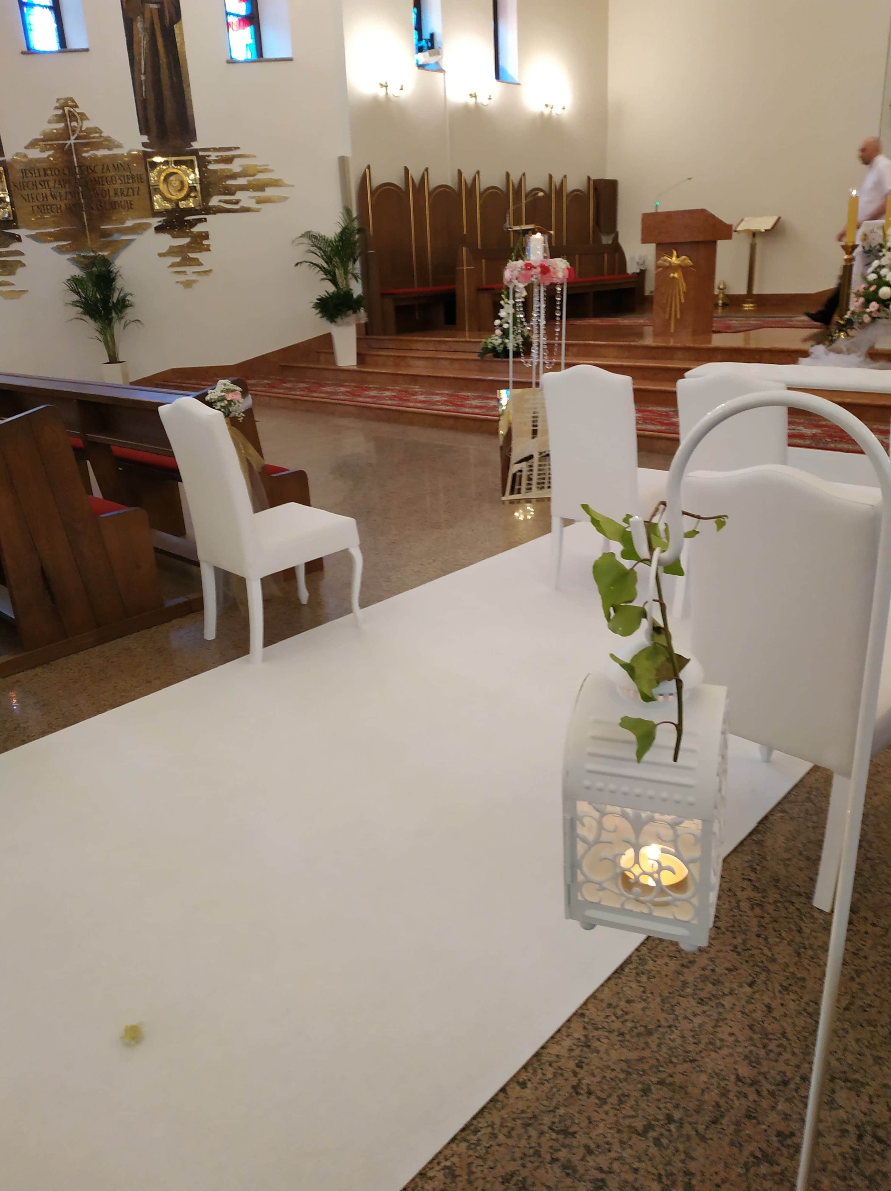 Dekoracje kościołów oraz sal weselnych. Posiadamy tysiące akcesoriów, m.in.: białe krzesła do kościoła i klęcznik, dywan, stojaki wysokie, lampiony, postumenty, tablice powitalne, tabliczki z hymnem o miłości, kandelabry, podtalerze, piękne świeczniki, serwety materiałowe i wiele innych.