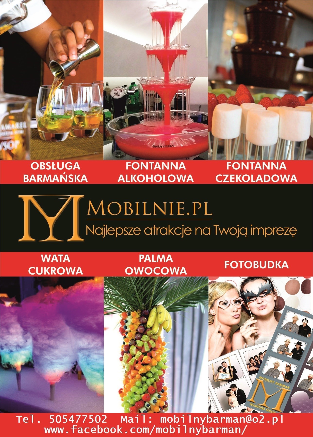 Witam!Organizujesz imprezę dla znajomych?Przyjecie rodzinne? Andrzejki lub SylwestraChcesz zaskoczyć towarzystwo?Zrobić DUŻĄ niespodziankę MAŁYM kosztem?Teraz masz świetną okazję Kompleksowa obsługa wszelkich imprez w zakresie usług barmańskich i nie tylko!OFERUJĘ RÓWNIEŻ:FOTOBUDKĘ, FONTANNĘ ALKOHOLOWĄ, FONTANNĘ CZEKOLADOWĄ, PALMĘ OWOCOWĄ CZEKOLADĘ DO PICIAWATĘ CUKROWĄTRANSPORT GOŚCIZapraszam do odwiedzenia mojej strony na Facebooku gdzie dowiesz się o najnowszych promocjach Teraz Twoi goście będą mogli powiedzieć, że alkohol naprawdę lał się strumieniami!Pracuje na swoim alkoholu jak i powierzonym od klienta!Oferuję obsługę:- przyjęć weselnych,- wieczorów panieńskich i kawalerskich,- poprawin,- bankietów,- jubileuszy,- imprez okolicznościowych- 18 urodzin,- domówek,- urodzin,- imieninZapytaj o ofertę podając w niej podstawowe dane:datę, ilość gości oraz miejsce, a także, którymi usługi Cię interesują.PROMOCYJNE CENY PAKIETÓW