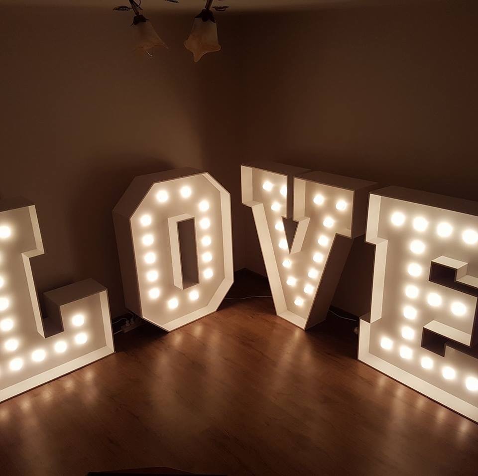 Oferujemy świecący napis LOVE idealny na wesele, przyjecie lub sesję zdjęciową NAPIS LOVE: - składa się z czterech liter - kolor biały - wysokość 120 cm - szerokość po rozstawieniu liter ok 5 - 5,5 m - wystające żarówki - możliwość regulacji natężenia oświetlenia Wyróżnij się z tłumu!!!! Spraw aby Wasza uroczystość była jedyna i niepowtarzalna a goście pamiętali ją mile i długo Napis LOVE 3D to wyjątkowa dekoracja, która doda charakteru każdemu przyjęciu. Ceny ustalane są indywidualnie - prosimy o przesyłanie zapytań lub kontakt telefoniczny. Cena obejmuje transport na umówione miejsce oraz montaż i demontaż dekoracji. ZAPRASZAMY!!!