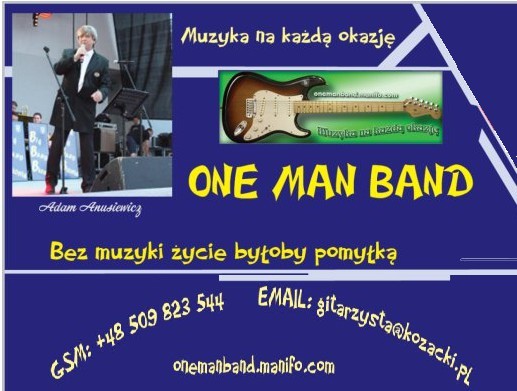 One Man Band - gitarzysta i wokalista o donośnym profesjonalnym tembrze głosu, zapewni niecodziennej jakości oprawę muzyczną imprez rodzinnych/firmowych. Tylko dla wymagających dojrzałej i profesjonalnej oprawy muzycznej par lub jubilatów. Śpiewający i profesjonalnie grający muzyk tworzy niepowtarzalną atmosferę prawdziwego koncertu w stylu charakterystycznym dla występów wielkich gwiazd pokroju Elvis Presley, Frank Sinatra, Krzysztof Krawczyk, Nat King Cole, Andrea Bocelli i inni. Swoim talentem i wysoką kulturą osobistą zdobył zaufanie wielu zleceniobiorców w kraju i za granicą, jak dotąd okraszone wyłącznie superlatywami! Możliwy występ w duecie mieszanym.