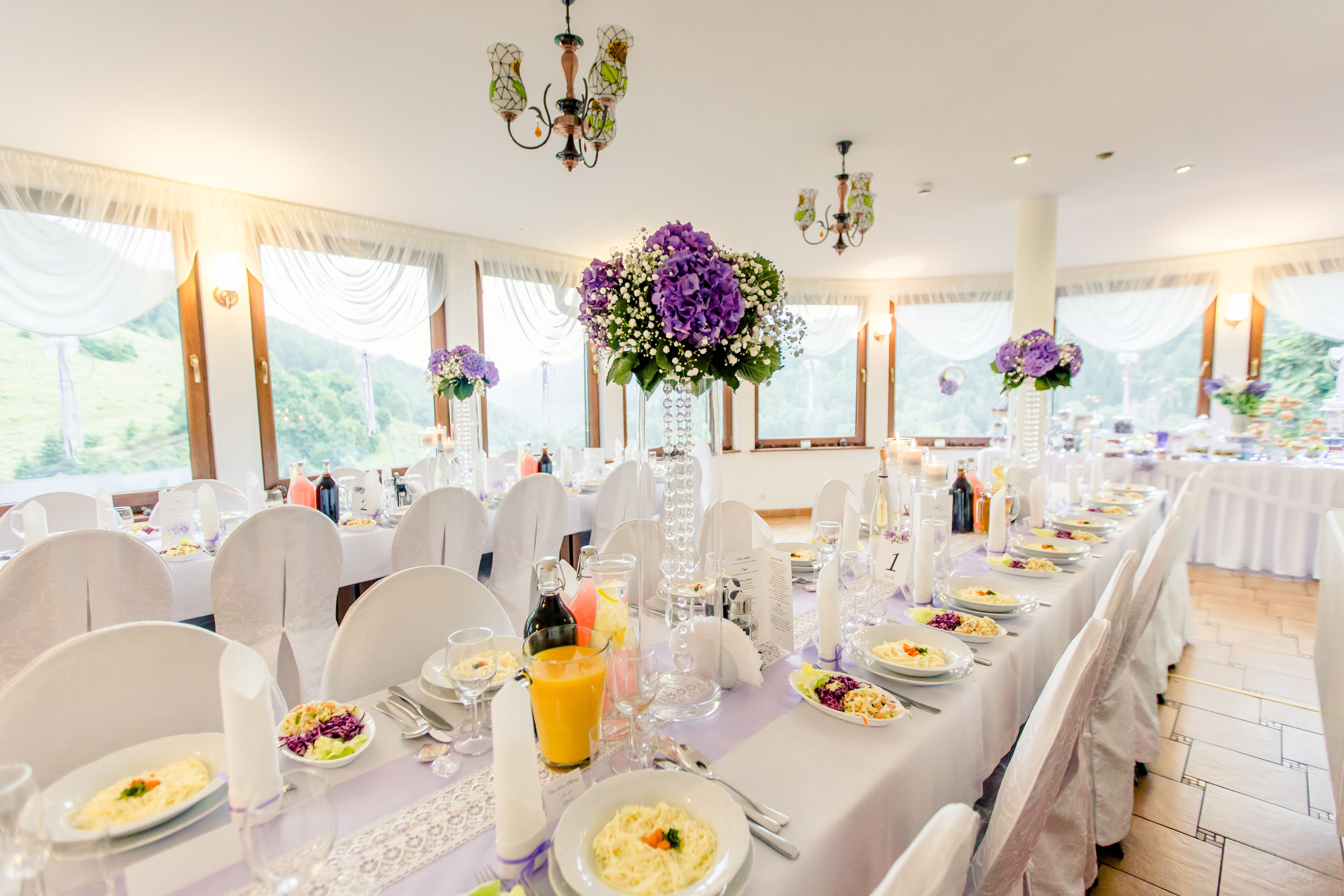 Przepiękna sala kryształowa to wizytówka Pensjonatu Pod Dębem. W sali może swobodnie bawić się do 130 osób. Wystrój wnętrza jest utrzymany w spokojnej, stonowanej kolorystyce. Elegancji dodają kryształowe żyrandole oraz iluminacje świetlne i subtelnie zaaranżowane stoliki. O komfort Gości dba system klimatyzacyjny, który zapewnia doskonałą cyrkulację powietrza, także w upalne dni. Niezwykłym miejscem w Sali Kryształowej jest urokliwa Oranżeria ze wspaniałym widokiem na dolinę.