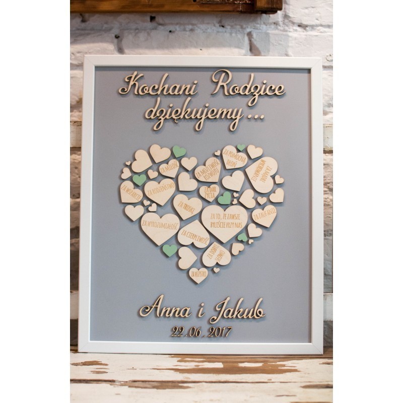 PODZIĘKOWANIA DLA RODZICÓW, DZIADKÓW, CHRZESTNYCH, ŚWIADKÓW Z SERCAMI W tym szczególnym dniu chciałbyś podziękować swoim bliskim za wszystko co dla Ciebie zrobili, powiedzieć im jak bardzo są dla Ciebie ważni, ile dla Ciebie znaczą. Oprócz pięknych i wzruszających słów podarujcie im prezent prosto z serca. Jeśli szukasz wyjątkowych, oryginalnych podziękowań, to moja propozycja powinna Ci się spodobać. Spersonalizowane podziękowania w formie obrazu, to bardzo osobisty prezent- wzruszenie obdarowanych gwarantowane. Oryginalna forma podziękowań, możliwość pełnej personalizacji sprawia, że jest to produkt wyjątkowy, niepowtarzalny, jedyny w swoim rodzaju. Masz możliwość wyboru formatu, koloru tła, ramy, koloru serduszek i napisów na nich. Zapraszam do stworzenia swojego serca!