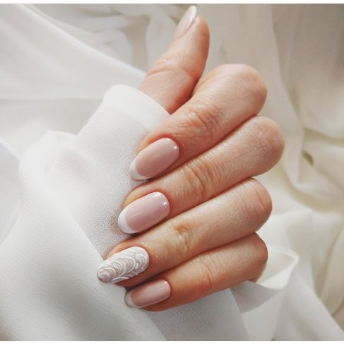 Stylowy french na paznokciach hybrydowych nadal nie wyszedł z mody. Można go jednak urozmaicić, dodając na jednym paznokciu delikatne zdobienie. Biały kolor będzie doskonale współgrał z suknią ślubną – podkreśli uroczysty charakter tego dnia, ale jednocześnie nie będzie odciągał uwagi od reszty stylizacji. French manicure prezentuje się pięknie na każdym kształcie paznokci – czy to migdałkach, czy kwadratowych paznokciach.