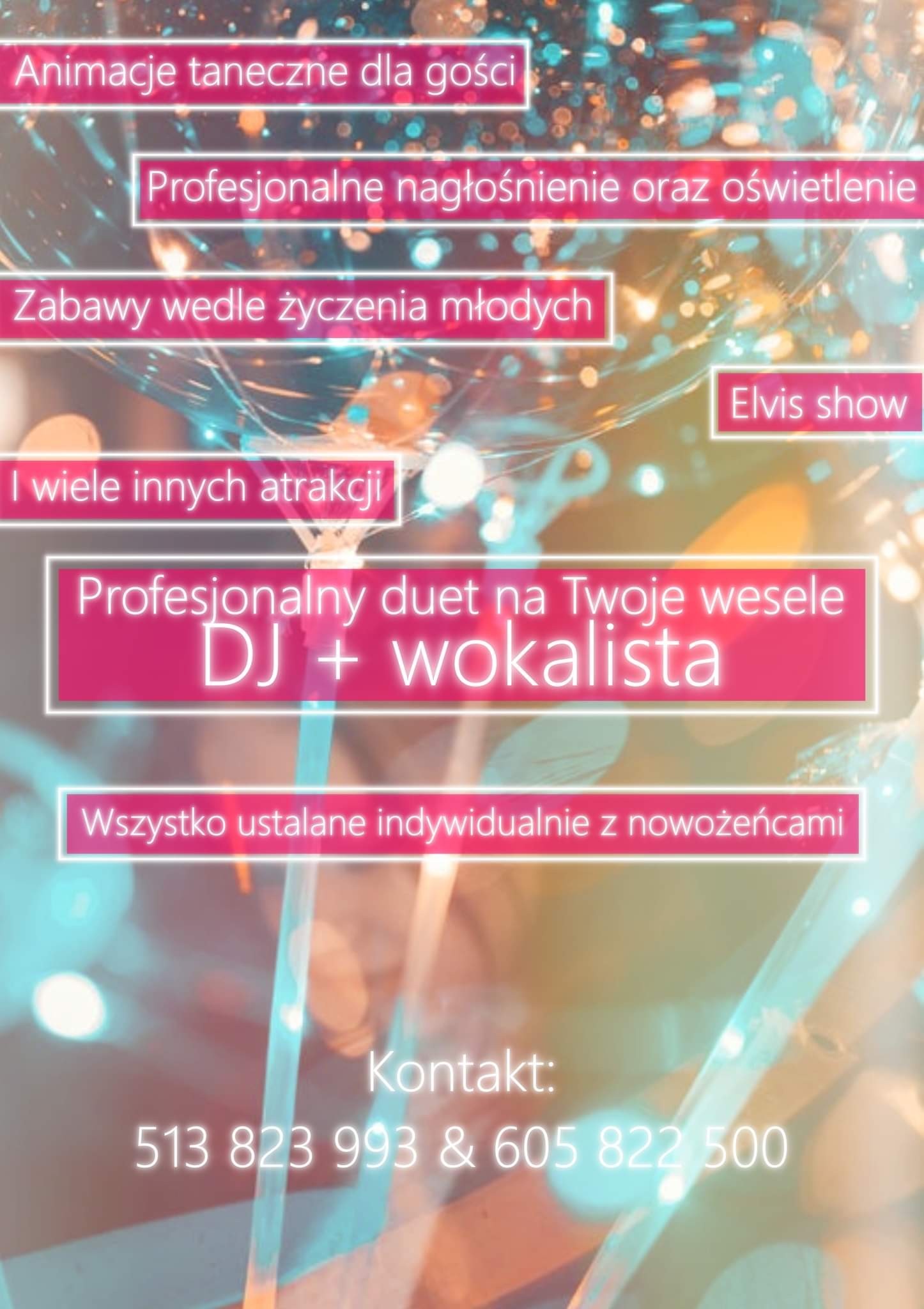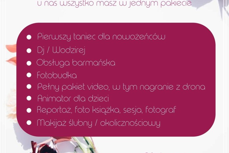 Zapraszamy serdecznie do zapoznania się z ofertą kompleksowej organizacji wesela. Gwarantujemy: nauka pierwszego tańca, Dj/Wodzirej, obsługa barmańska, fotobudka, animator dla dzieci, pakiet video oraz foto.