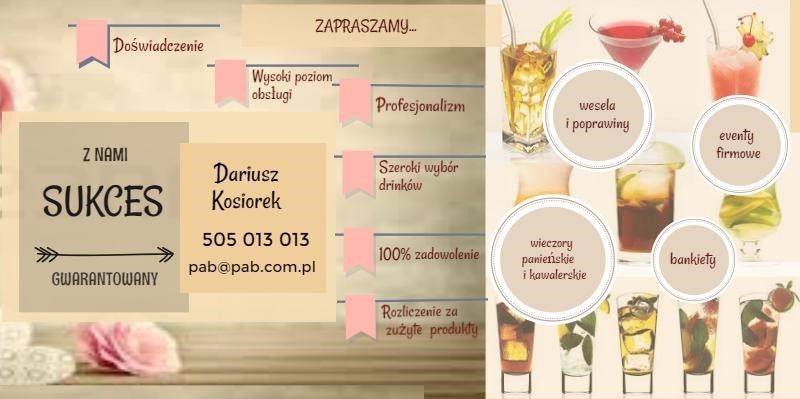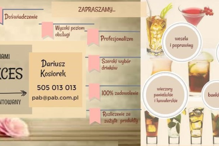 Pan Darek przygotowywał i realizował oprawę barmańską przyjęcia z okazji 18 - tych urodzin mojej córki. Doświadczenie i profesjonalizm widoczne były na każdym etapie realizacji zamówienia. Wspólne ustalenie wykazu drinków na przyjęcie- to jedyna czynność jaką musiałam wykonać w zakresie realizacji obsługi barmańskiej przyjęcia. Jeszcze jedna, przyjemna czynność - w trakcie przyjęcia degustacja wspaniale smakujących i także samo wygladających koktajlii. Mojito - zjawiskowe. Najlepsze w naszej szerokości geograficznej...Podobałą mi sie także forma rozliczenia za faktycznie zużyte surowce. Nienaganna technika barmańska wzbogacona o dzielenie się wiedzą z zakresu miksologii z gośćmi oczekującymi na wymarzonego drinka. To cecha tylko niektórych firm zajmujących się świadczeniem usług barmańskich.Wesele , pewnie za jakiś czas- z Panem Darkiem za barem. Sprawdzona firma godna polecenia, która nie zawodzi.