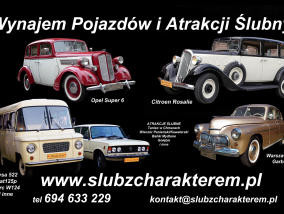 Polecamy nasze samochody na Ślub z Charakterem:W ofercie: CITROEN ROSALIE FAMILIARE z 1935 roku. Przestronny, siedmioosobowy samochód w kolorach klasycznej czerni połączonej z ecru. OPEL SUPER 6 z 1936 roku – jedyny taki w Polsce, w kolorach wiśni po...