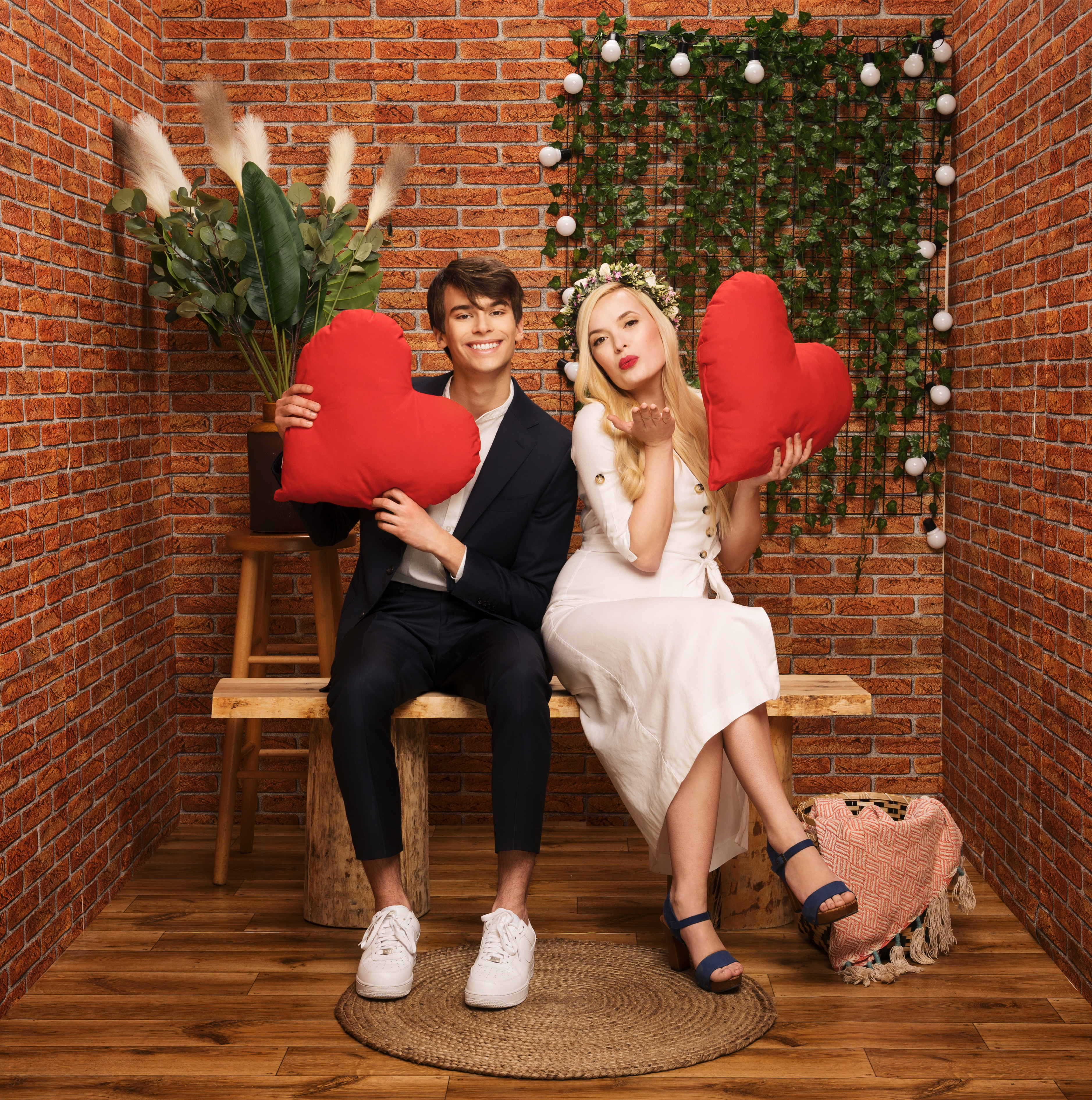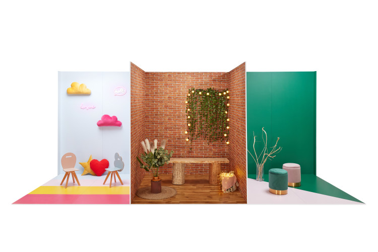 Box 2 Rockowe Boho to box-kameleon, przemienia się wraz z użytymi dodatkami. Może zyskać rockowy charakter, ale też cudownie wpisać w stylistykę boho. Zachwyci więc i pannę młodą, i kolegę z kapeli. Ściana z cegiełkową tapetą nadaje industrialny wygląd, a zawieszona na górze lampka oraz kratownica z zawieszonymi pnączami i światełkami - niepowtarzalny klimat. Podłoga jest imitacją drewna, na której można rozłożyć dywanik w stylu boho lub orientalnym. Scenografię do zdjęć dopełnia stworzona z drewna i pieńków ława oraz motywy roślinne - wazony ze sztucznymi kwiatami i wiązankami trawy.