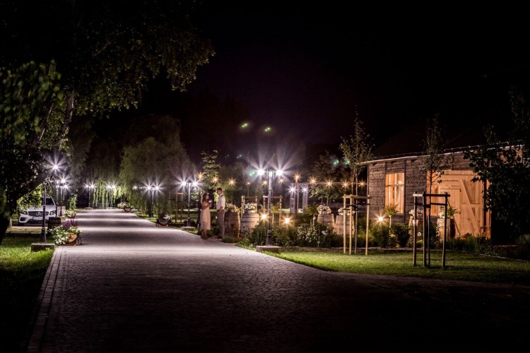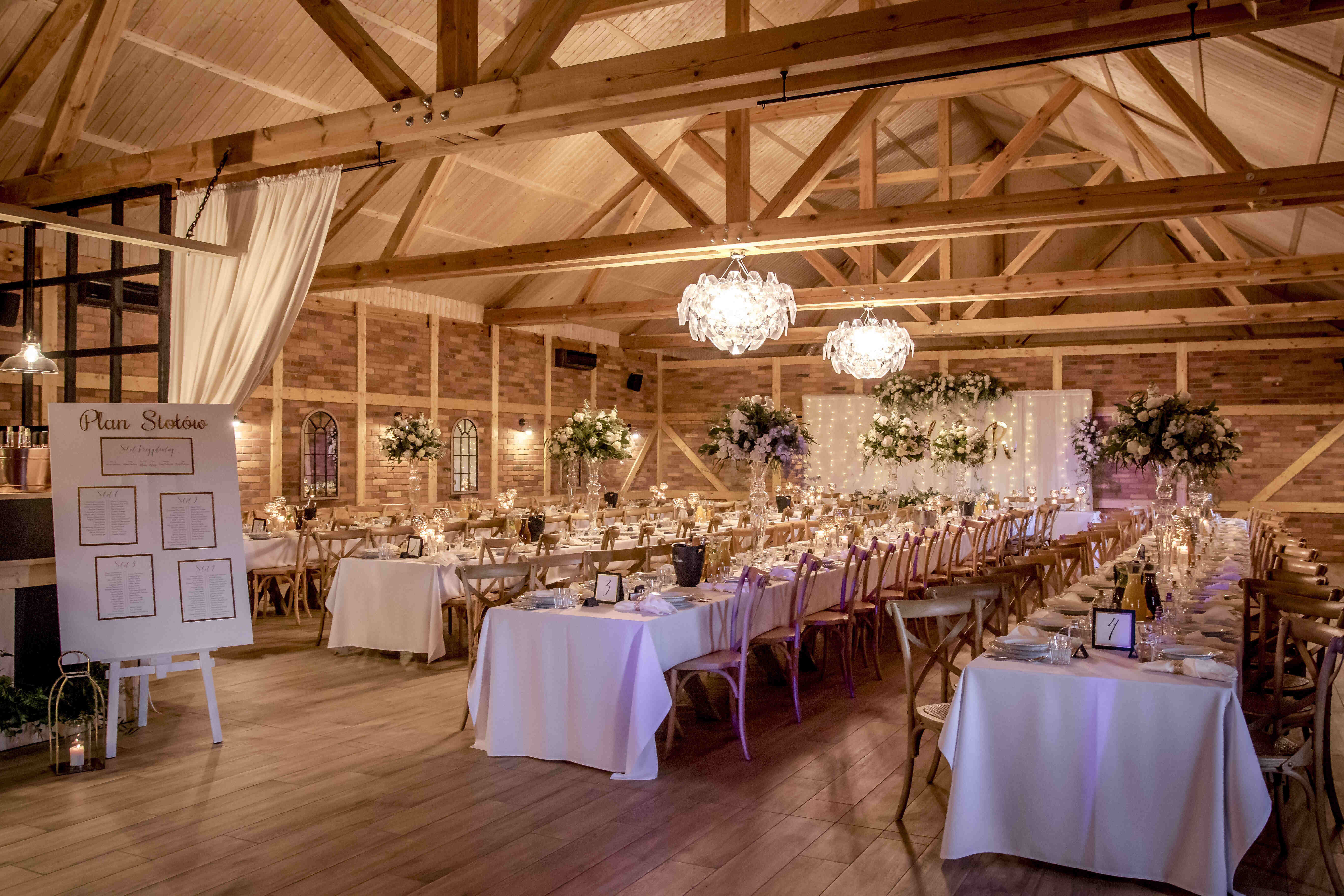 Sala Spichlerz - Ogromna przestrzeń 500 m2 pozwala na organizację przyjęcia na ponad 250 osób. Kryształowe żyrandole dodają elegancji rustykalnemu wystrojowi wnętrz. Naturalne drewno położone na ścianach oraz pełne kwiatów patio sprawia, że Spichlerz jest miejscem unikatowym i niepowtarzalnym.