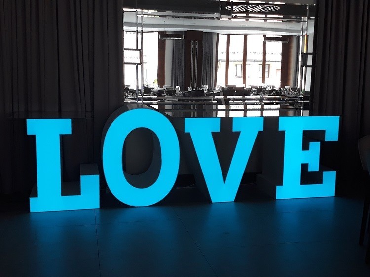 Podświetlane litery LOVE jako dekoracyjny napis lub jako SŁODKI STÓŁ.