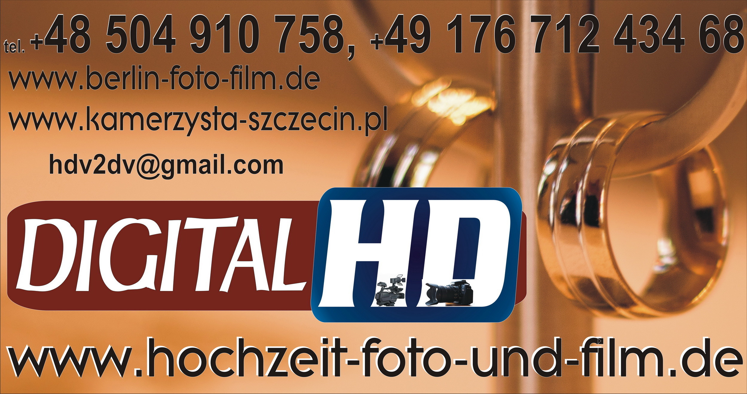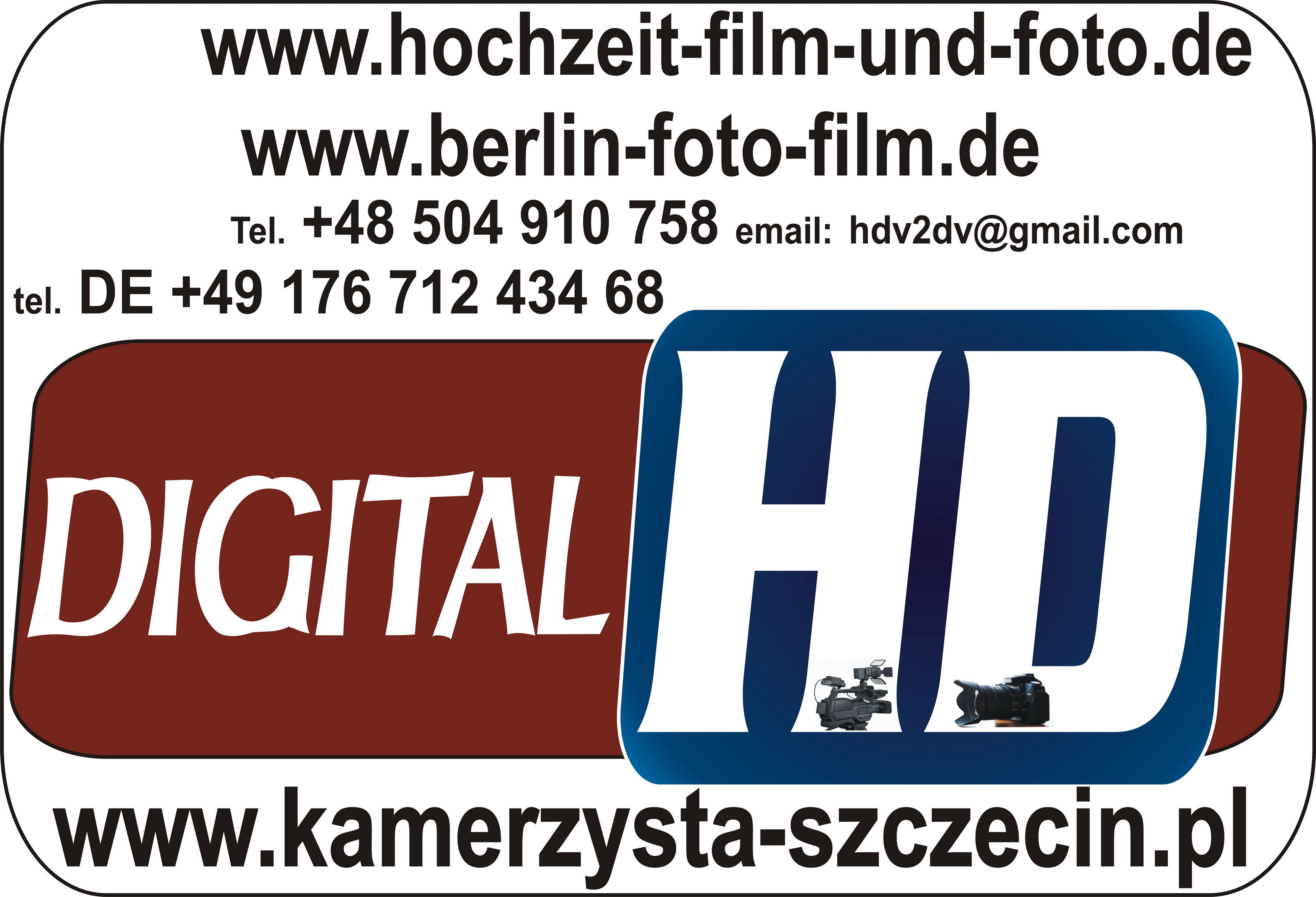 Studio Hochzeit Foto und FilmJesteśmy rodzinną Firmą i od 3 pokoleń świadczymy kompleksowe i profesjonalne usługi w zakresie Fotografii i Filmowania. Przede wszystkim Nasz Kamerzysta i Fotograf Działa w tej branży nieprzerwanie od 1990 roku. Od samego początku swojego istnienia ogromny nacisk kładziemy na wysoką jakość naszych usług. Naszą specjalizacją jest fotografia i filmowanie Reportaży Ślubnych ale wykonujemy także Pierwsze Komunie Święte, Chrzciny, Studniówki, Fotografie i Filmy Reklamowe, Teledyski, Imieniny, Urodziny, Rocznice Ślubu a także Reportaże z koncertów i innych imprez, itd. A ponadto wreszcie.Nasz zespół fachowców posiada odpowiednie doświadczenie oraz warsztat, ale także pasję i zaangażowanie w wykonywaną pracę. Kamerzysta i Fotograf oferuje Filmowanie Reportaży z Uroczystości oraz zleceń dla małych i dużych firm. W związku z tym pracujemy na terenie Polski oraz zagranicą głównie w Niemczech. Doceniamy swobodę działań, którą nam zostawiacie przy Filmowaniu i Fotografowaniu i dziękujemy za udzielone Nam zaufanie. Dzięki Wam działamy w pełni kreatywnie, korzystając z naszego bogatego doświadczenia i nowoczesnych technologii, w związku z tym NaszKamerzysta i FotografUważa że Szczęścia nie kupicie nigdzie Miłość da Wam je Gratis. Wprowadzenie wywiadów z gośćmi weselnymi powoduje, że nasz film zyskuje cechy prawdziwego dokumentu. Ciekawe kadry, obfitość detali, uchwycenie każdego momentu wraz z muzyką potęgują emocje, sprawiają, że Nasze Filmy są ponadczasowe. Szczególnie ważna jest umiejętność współpracy z Młodą Parą. Każdy Film Weselny, jest wyjątkowy i bezkonkurencyjny. Jako Studio Hochzeit Foto und Filmz pewnością jeszcze bardziej cenimy sobie indywidualny kontakt z Państwem. Dlatego wspólnie planujemy każdy element składający się na efekt końcowy. Po wspaniałej uroczystości pozostają tylko wspomnienia. Film i Fotografie ze Ślubu i Wesela pozwalają utrwalić każdą wyjątkową i wzruszającą chwilę. Po to jesteśmy, aby Film i Fotografie pozostały z Wami na Zawsze. I dla tego, przede wszystkim: Spełniamy Wasze Najskrytsze MarzeniaKochamy To Co Robimy, i Robimy To Co Kochamy.KontaktStudio Foto Video Hochzeitsfilm und Hochzeitsfototel. – Jakub – 0048 504 910 758,tel. Tomek – 0049 176 712 434 68email: kamerzysta.fotograf.szczecin@gmail.com