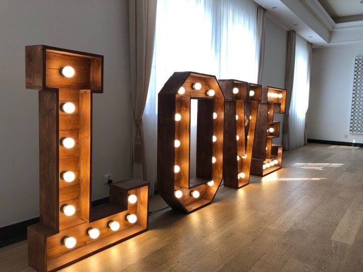 Wynajem napisu love drewnianego (brązowy) -oświetlenie żarówkami led -pomalowany brązową lakierobejcą podkreślającą słoje drewna - wysokość napisu 130 cm CENA 400 złotych za dobę/550 za dwie doby