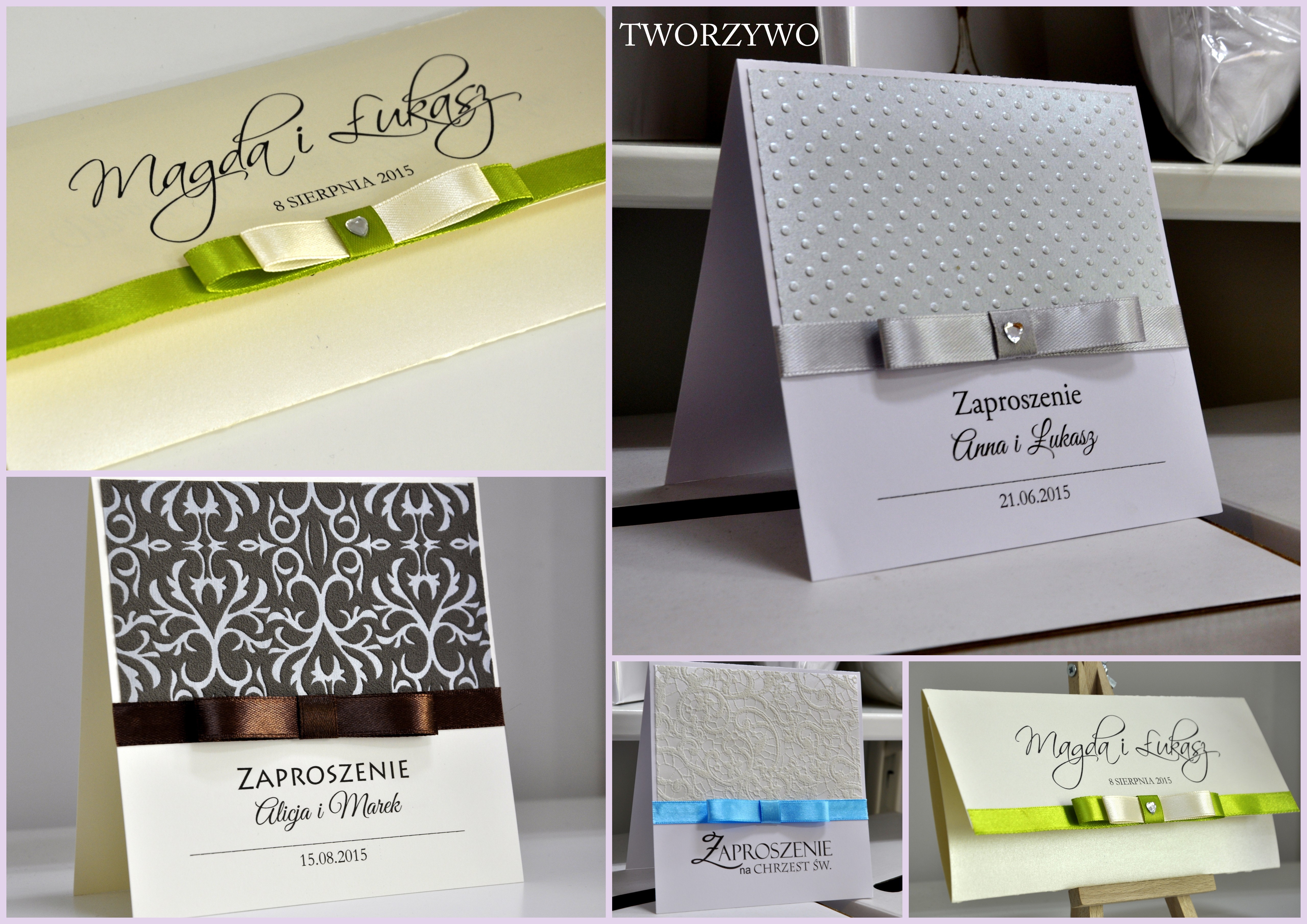 Pracownia artystyczna TWORZYWO oferuje ręcznie robione zaproszenia, zawieszki na alkohol, winietki oraz wszelkie dodatki ślubne.