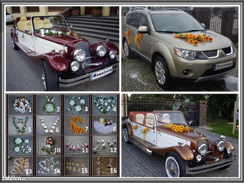 Przy wynajmie samochodu możliwość wyboru 14 przybrań ze sztucznych kwiatów oraz tablice dla nowożeńców.