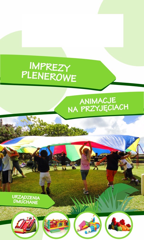 Kompleksowa organizacja zabaw dla dzieci, podczas przyjęć weselnych, komunijnych oraz imprez rodzinnych. Zabawy prowadzone przez wykwalifikowane Animatorki zabaw, siedmioletnie doświadczenie, różnorodne atrakcje i mnóstwo opcji dodatkowych takich jak: zamki i zjeżdżalnie dmuchane, wata cukrowa, balony z helem, klaun, opieka nocna itd.
