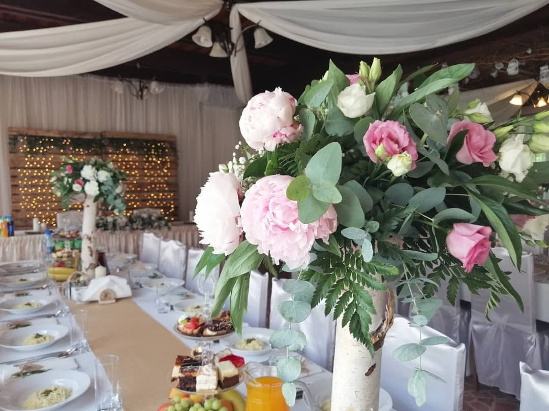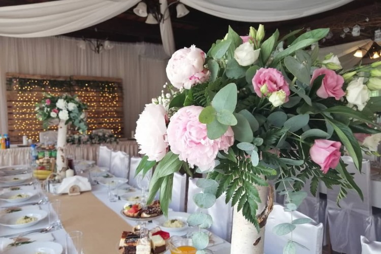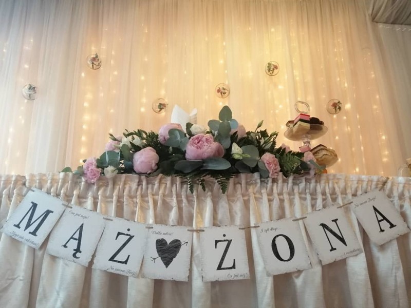 * podstawową dekorację stołów (białe obrusy, kompozycje serwet, świeże kwiaty oraz dodatki dekoracyjne w wybranej przez Państwa kolorystyce, pokrowce na krzesła)