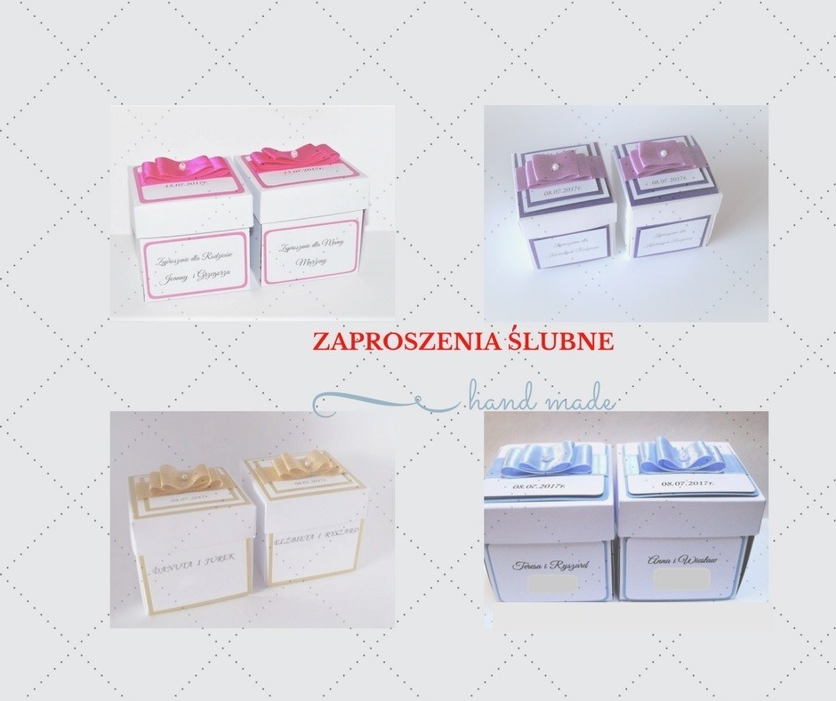 Zaproszenia ślubne dla najbardziej wyjątkowych gości: Rodziców, chrzestnych, świadków itp. Wykonujemy je ręcznie bardzo pracochłonną metodą scrapbooking w naszej pracowni artystycznej. Pudełeczko ma rozmiary 7 x 7 x 7 cm. Po zdjęciu pokrywki pudełeczko rozkłada się w gotowe zaproszenie. Kolorystyka dowolna, zawsze podstawą (bazą) jest kolor biały. Kolory dodatkowe - ramki i wstążeczka w dowolnym kolorze. Tekst, który będzie wydrukowany w zaproszeniu - dowolny- podzielony zostanie na 4 kwadraciki. Część centralną zaproszenia stanowi ozdoba- albo dwa serduszka na wstążeczce albo zdjęcie pary młodych.