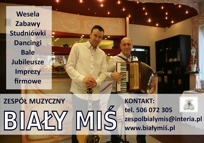 Zespół muzyczny BIAŁY MIŚ - oprawa muzyczna wesel, zabaw, imprez, balów, studniówek oraz osiemnastek, konkursy na weselu,Witamy na stronie zespołu muzycznego "BIAŁY MIŚ". Jeśli szukasz zespołu na imprezę świetnie trafiłeś. Zajmujemy się oprawą muzyczną wesel, balów, studniówek czy osiemnastek. Nasza oferta przewiduje również oprawę dancingów, zabaw dla seniorów jak również zabaw dla dzieci. Organizacją i obsługą muzyczną imprez artystycznych zajmujemy się od wielu lat. Nabyte doświadczenie pozwala z pełną odpowiedzialnością powiedzieć, że impreza z nami to gwarancja świetnej i udanej zabawy.Gwarantujemy doskonałą, dynamiczną zabawę wypełnioną bogatym, znanym i lubianym repertuarem muzyki tanecznej. Ponadto w programie zabawy i konkursy dopasowane do obecnych na sali gości oraz profesjonalna konferansjerka. W kilka chwil potrafimy dostosować repertuar i stworzyć odpowiednią atmosferę zabawy. Dużą wagę przywiązujemy do poziomu świadczonych przez nas usług. Dowodem tego jest duże zainteresowanie i spora ilość zleceń, ale przede wszystkim zadowolenie klientów.W naszym programie usłyszycie największe przeboje muzyki tanecznej. Zapewniamy profesjonalny sprzęt, nagłośnienie oraz oświetlenie.