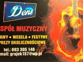 Szanowni PaństwoZesp muzyczny Dens to grupa sześciu muzyk z Gy Kalwarii oferująca usługi na najwyższym poziomie. Gramy muzykę wyłącznie na żywo. Nasz skład to: klawisze, perkusja, akordeon, gitara, bas, saksofon, trąbka. Do tego pięć męskich wokali ,...